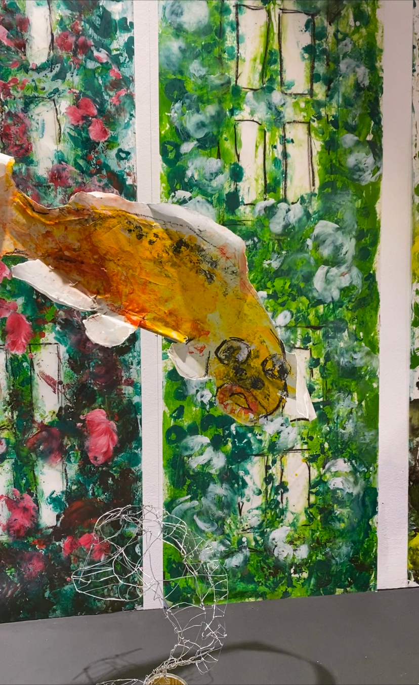 Charaktervolle Tiere, wie farbenprächtige Kois die lebensfroh aus ihren Fischdosen zu springen scheinen, bewegen sich sanft im Raum.